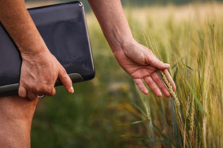 Agronomist with the tablet touches the green wheat sprouts at the field and examines the quality of the new crop. Farmer sends data about growth progress from the field to the database