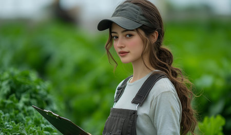 a woman standing confidently in the middle of a vegetable farm, holding a clipboard and giving instructions to workers, surrounded by lush greenery and farm tools, bright natural daylight