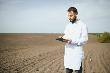 Young agronomist checking soil quality at field