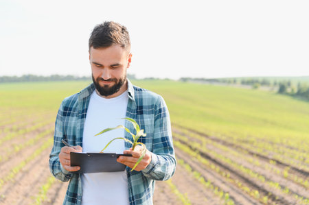 Agronomist examining corn sprout and writing notes on clipboard, standing in cultivated field during sunny day