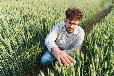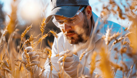 Agronomist analyzing the growth of wheat plants in a cultivated field, ensuring healthy crop development for sustainable agriculture