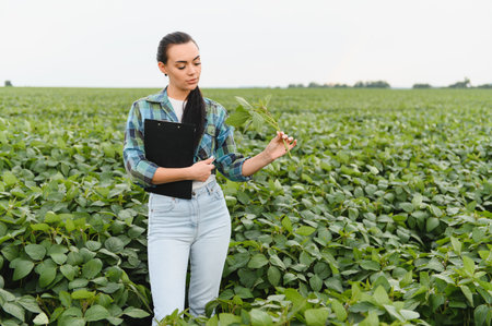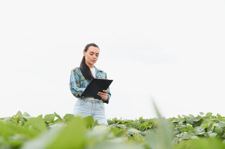 Female farmer writing notes on clipboard while inspecting crops in a soybean field, ensuring healthy growth and planning for a successful harvest
