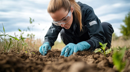A woman carefully plants seeds in garden soil, wearing gloves and goggles. The outdoor scene captures her dedication to nature and sustainable gardening practices.