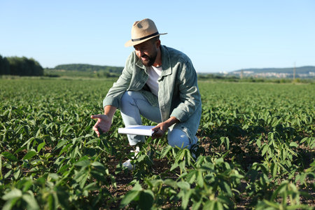 Young agronomist holding clipboard and inspecting cultivated soybean plants in agricultural field