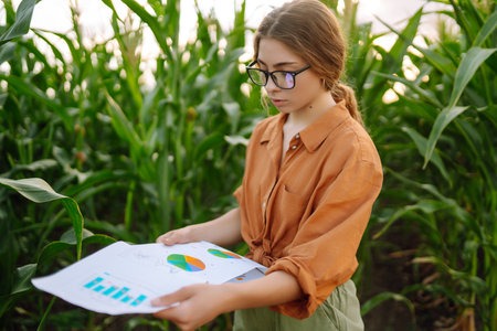 Agronomist is examining a corn plant and taking notes on a clipboard while standing in a cultivated field