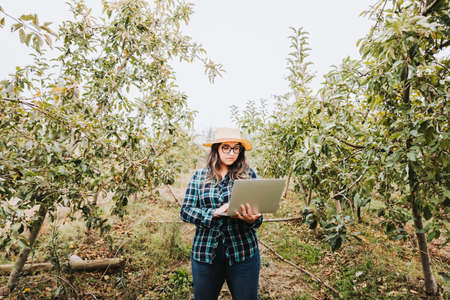 Young latin farmer woman using a laptop to control the production of her farmland.