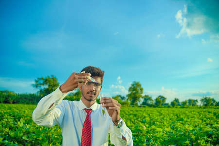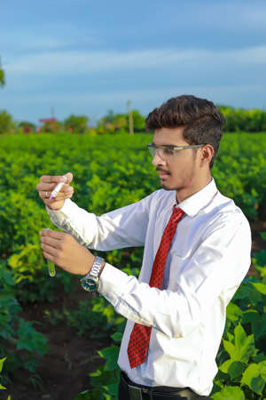 Young indian agronomist with test tube, Agriculture and scientist concept.