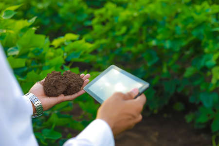 Female researchers examined soil with a modern concept tablet.