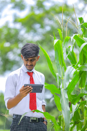 Young indian agronomist analyze corn field and looking some information in smartphone