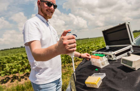 Laboratory worker testing plant sprouts before harvest in the field.