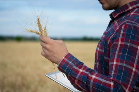 Smart farming using modern technologies in agriculture. Man agronomist farmer with digital tablet computer in wheat field using apps and internet, selective focus