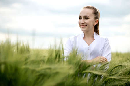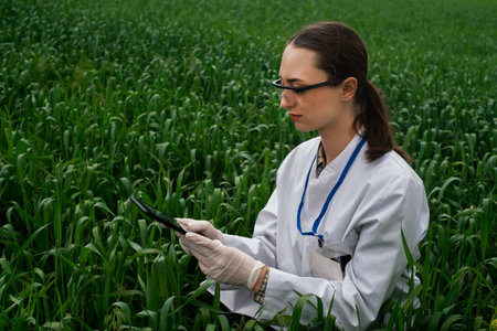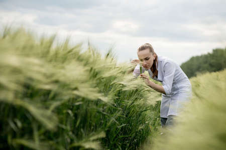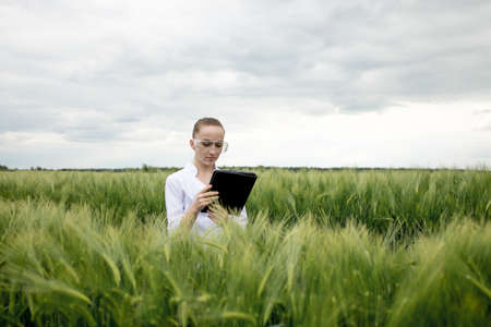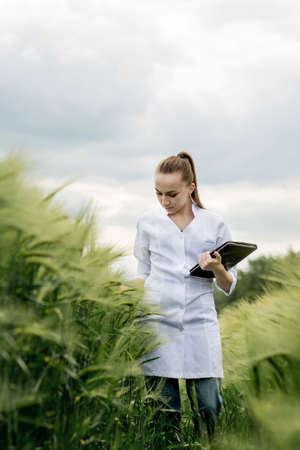 a female agronomist in a white coat checks the growth of plants in the field. A biologist in the field checks the readings of wheat, a farmer takes notes on a tablet, agribusiness concept