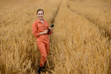 Woman caucasian technologist agronomist with tablet computer in the field of wheat checking quality and growth of crops for agriculture. Agriculture and harvesting concept