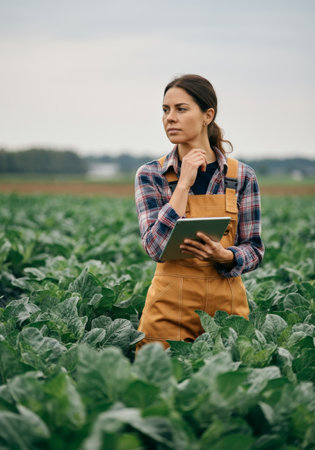 Female farmer analyzing crop growth in lush green field with digital tablet.