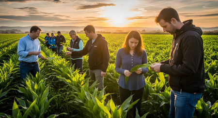 A group of agricultural researchers or students inspects the leaves of tall corn plants in a field at sunset. They are discussing crop health and agronomy in a collaborative outdoor learning environment.