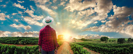 Farmer or working with hat on coffee field at sunset cloudy day
