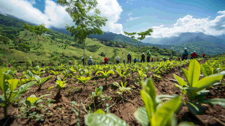 A lush green landscape with young trees being planted by volunteers, showcasing efforts in land restoration