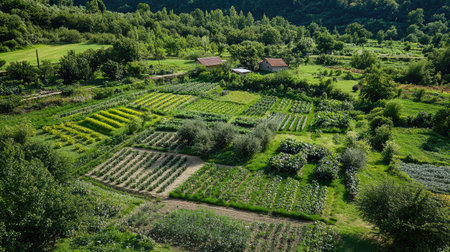 aerial view of lush organic vegetable fields, created with generative ai