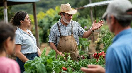 Farmers share knowledge on sustainable practices in a community garden during daylight hours