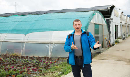 Male gardener standing near hothouse while gardening outdoor