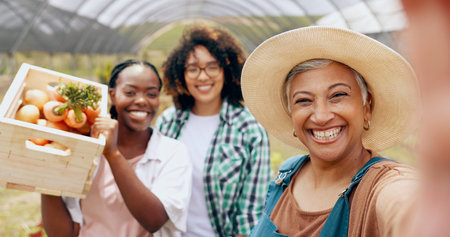 Farm, selfie and women in a greenhouse for vegetable harvest, agriculture or small business. Sustainability, face or happy farmer team in nature for agro profile picture, social media or startup blog