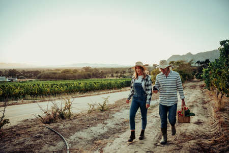 Caucasian romantic couple walking at sunrise through farmlands holding basket of fresh vegetables