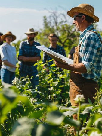 Expert farmer teaching modern farming insights to a group, standing in a vibrant field, educational materials present, students engaged
