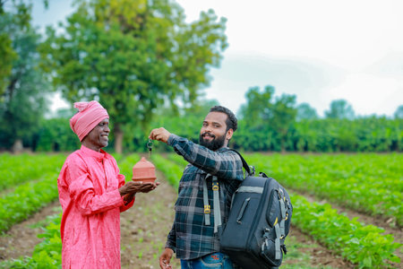 Young indian farmer welcome to bank officer at agriculture field