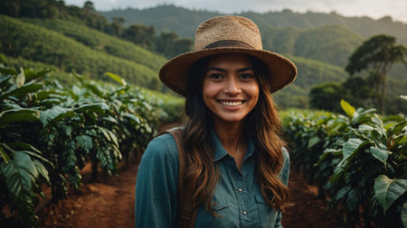 Smiling asian woman in coffee plantation. Young woman with hat standing in coffee plantation.