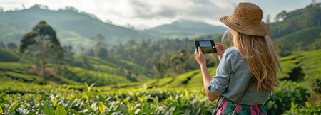 Influencer traveller woman taking a video with her phone and sharing it through an app about her trip to a well-known natural landmark—tea plantations