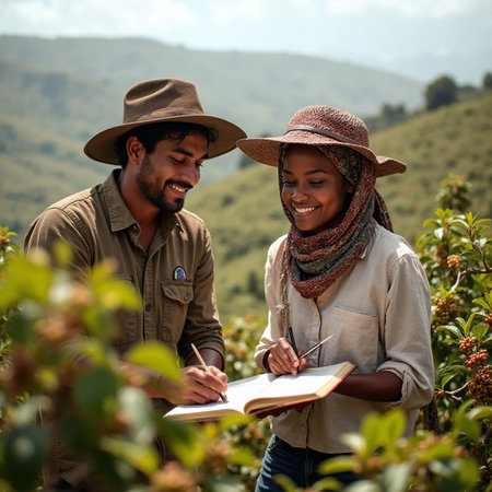 Close up view of freshly picked red coffee berries held in a palm against a distant scene of manual labor on a misty, sunlit tropical mountain slope.