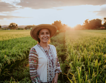 Portrait of a woman farmer standing in the rice field at sunset.