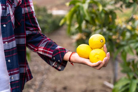 A woman's hand with freshly picked lemons in the field. Organic garden concepts.
