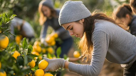 Several young women carefully gather ripe lemons from green bushes in a vibrant orchard. They wear gloves and light clothing, enjoying the warm sunshine on a pleasant afternoon.