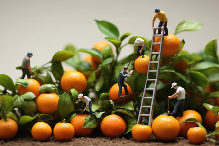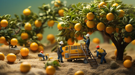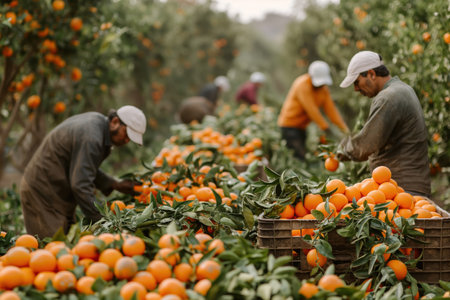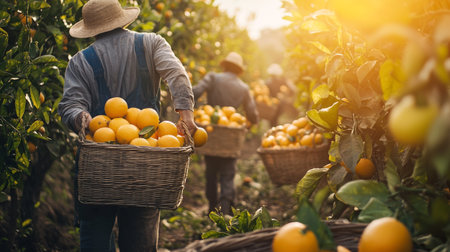Farmers working hard picking ripe oranges in a sunny orchard, surrounded by an abundance of fresh fruit