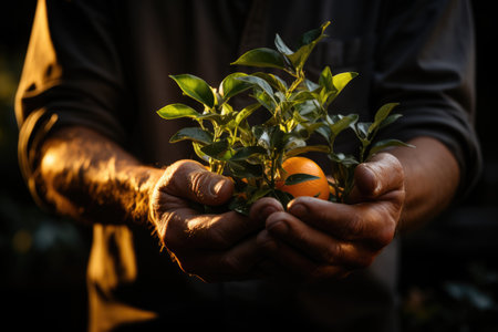 A gardener's hands gently picking a ripe orange from a tree, highlighting the connection between people and nature