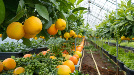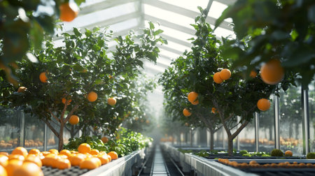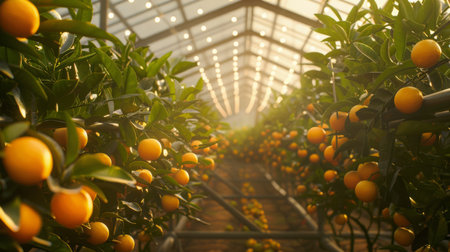 Lush Orange Grove Inside Glasshouse at Sunrise With Ripe Oranges