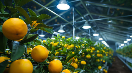 Indoor Citrus Farming Under Vibrant LED Lights at Twilight