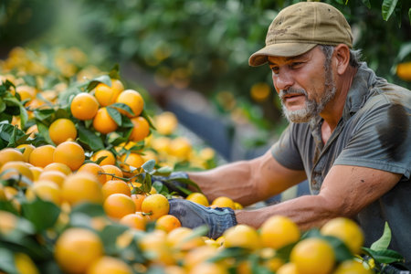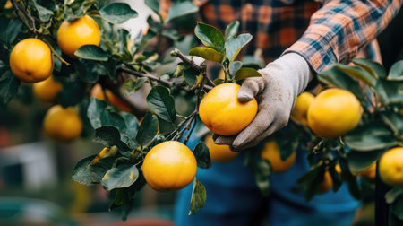 A gardener delicately picks ripe oranges from a vibrant tree in an orchard, showcasing the beauty of nature and the joy of harvesting fresh fruit.