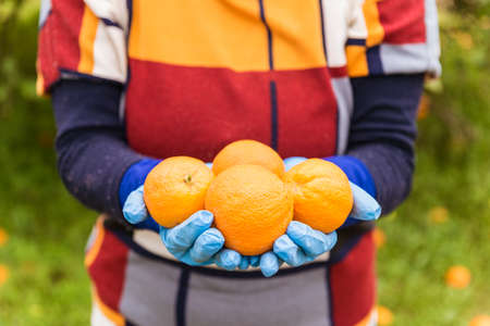 Woman 's hand holding orange mandarins in her hands in orange garden. image