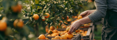 Farmer carefully picks a ripe orange from a tree in a sunlit orchard, gently placing it in a wooden crate filled with freshly harvested fruit