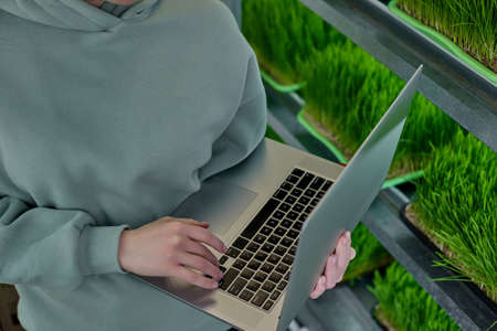 View from above of girl in warm green suit with laptop in hands next to shelves filled with wheat microgreens. Wheat sprouts in plastic containers stand on racks where farmer makes round making report
