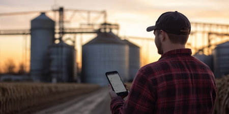 As the sun sets behind tall silos, a diligent farmer checks grain storage data on his smartphone, blending modern technology with timeless agricultural traditions passed through generations