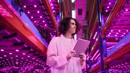 Worker with tablet on aquaponic farm, sustainable business and artificial lighting.
