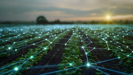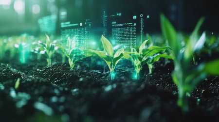 A growing field of seedlings is digitally enhanced, showcasing technology's role in agriculture with data overlays, symbolizing the harmony between nature and innovation.