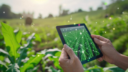 A person holds a tablet displaying data analytics in a vibrant green field. The scene captures the fusion of technology and agriculture under a clear sky, emphasizing modern farming practices.