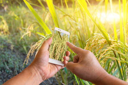 The farmer holds a smartphone and touches the screen to connect the intelligent management system within the farm. smart farmers research and market information online.
