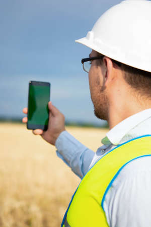 an engineer is working on his smartphone in the field, an agricultural engineer is standing in the field, an engineer is holding a phone in his hand, an engineer is wearing a helmet and yellow vest