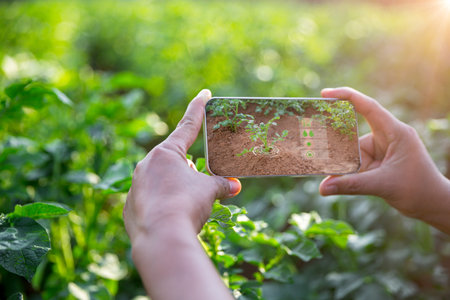 Smart farming with IoT internet of things, Growing potato seedling with infographics. Smart farming and precision agriculture 4.0. modern agricultural technology and data management to industry farm