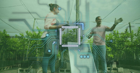 Walking woman in striped-apron holding tablet, gloved man lifting solar panel in nursery, overlays. Greenhouse, horticulture, seedlings, plants, collaboration, teamwork, technology
